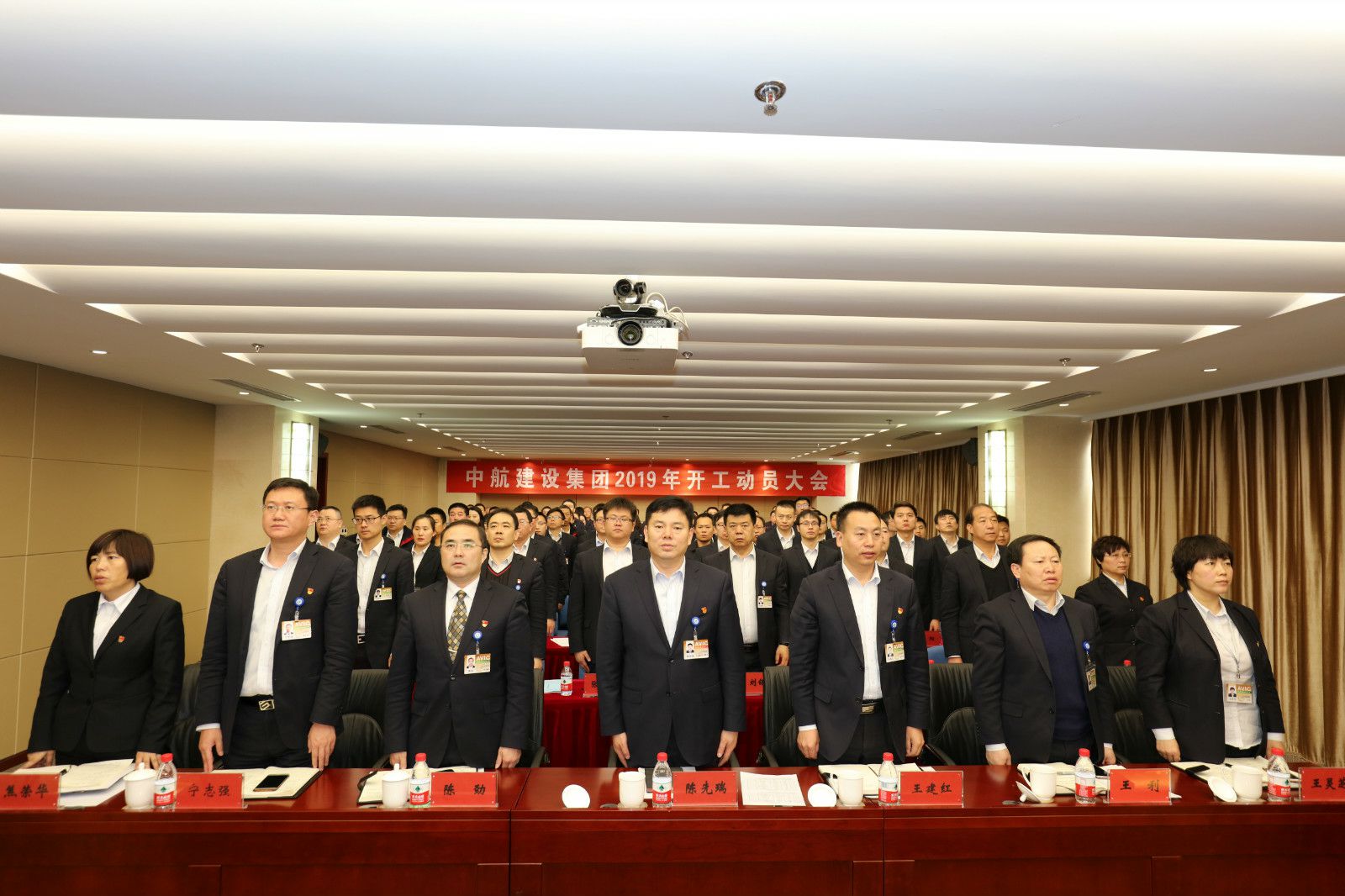 9时整,大会在雄壮的国歌声中开始。集团公司总经理王建红作了开工动员并下达了年度经营任务;生产副总经理王利下达了年度施工生产任务;总工程师陈劲下达了年度技术质量和科技创新任务。京内外各项目部签领了年度经营、生产、技术质量和科技创新任务书。