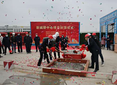 2022年1月25日,集团公司承建的四川成都新城驿中心项目(一标段),在施工现场举行结构封顶仪式。现场装饰一新,呈现出一派喜庆祥和的氛围。项目建设、监理单位代表,项目部相关人员参加仪式。